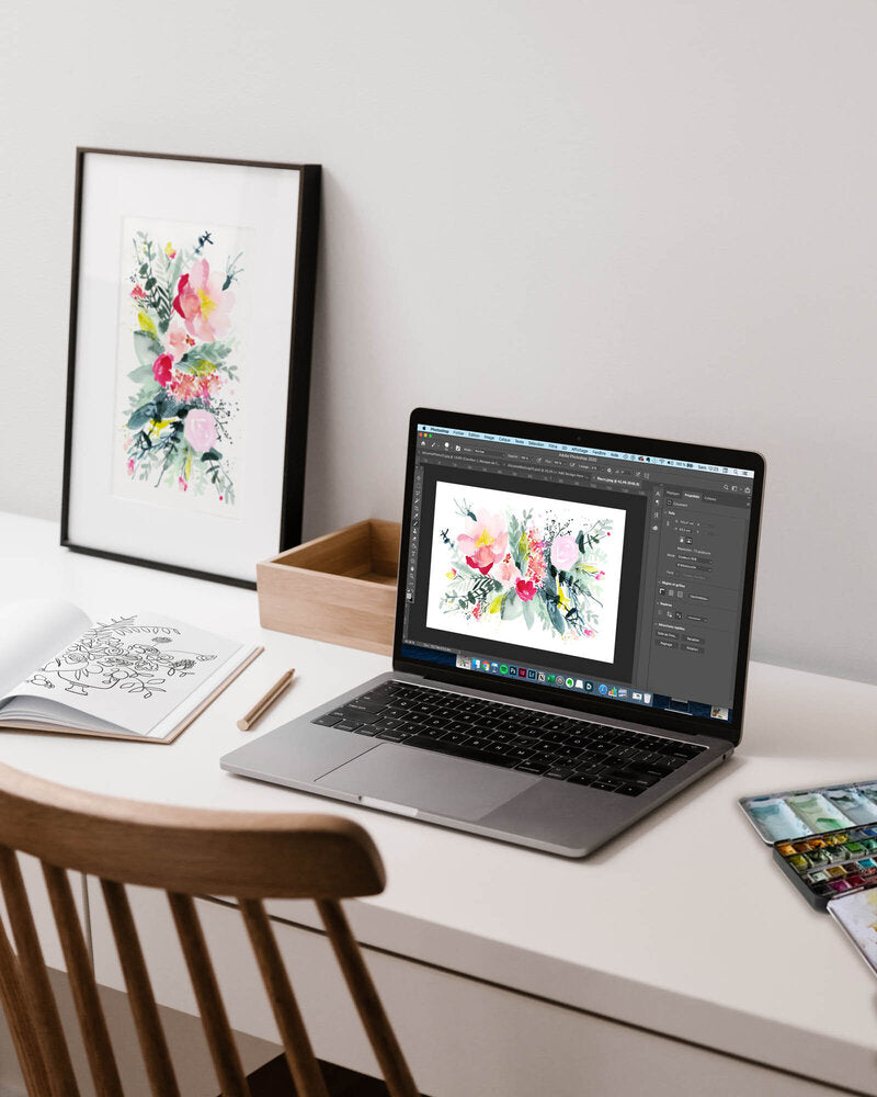 Vous apprendrez comment transformer votre art en fichiers numériques et démultiplier ses possibilités grâce aux outils de Photoshop. Enlever le papier (détourer vos créations), placer votre art dans des mockup comme s’il était sur des produits réels, combiner texte et création, apprendre les bases de la création d'un motif ou encore créer des photos lumineuses pour mettre en valeur votre travail… autant de compétences à votre portée grâce à ce cours, même si vous n’avez jamais utilisé Photoshop !